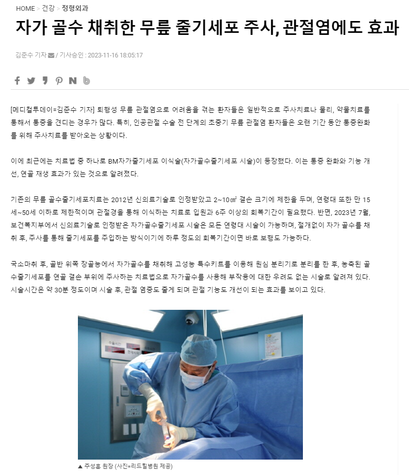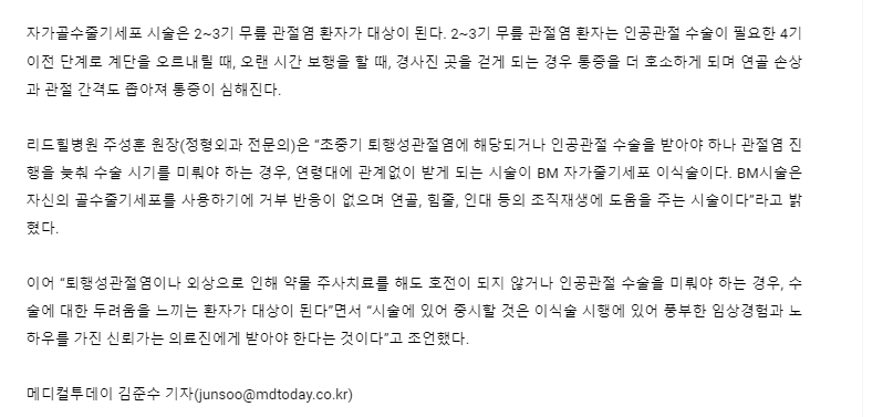 무릎 관절염 치료를 위한 자가 골수줄기세포 주사 BM시술 _ 메디소비자뉴스