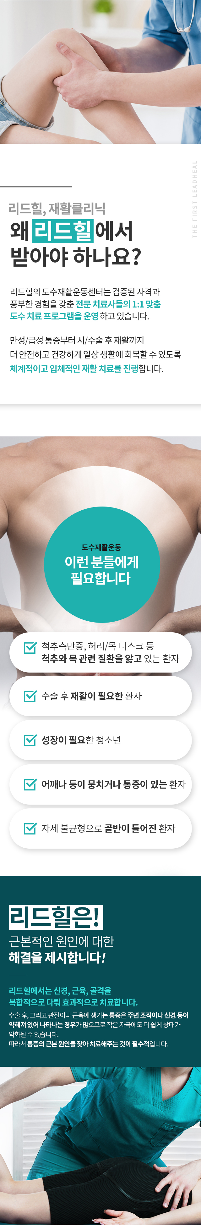 질병이나 손상으로 인해 발생하는 근골격계의 비정상적인 기능을 정상 또는 정상에 가까운 상태로 회복시키거나 보다 나은 상태를 유지하기 위해 시행하는 프로그램입니다. 개개인의 특성을 고려한 맞춤형 진단과 평가 시스템을 통해 운동조절능력과 호흡기능 개선 등 신체적 밸런스와 기능의 향상을 끌어올리는 차별환된 치료 시스템을 제공합니다.